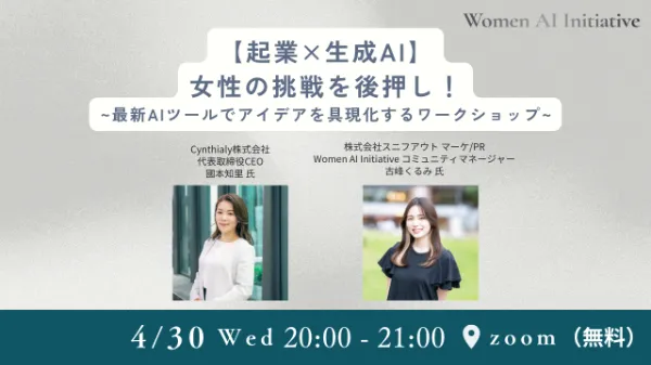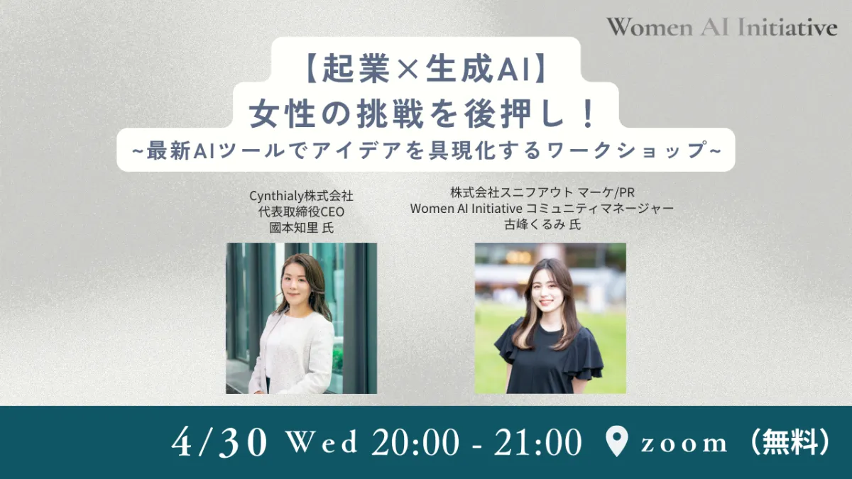 2025年4月30日(水)、「Women AI Initiative」のmeet up イベント #15 をオンラインにて開催しました。CEO國本より【起業×生成AI】女性の挑戦を後押し!〜生成AIツールでアイデアを具現化する〜をテーマにトークセッションが行われました。