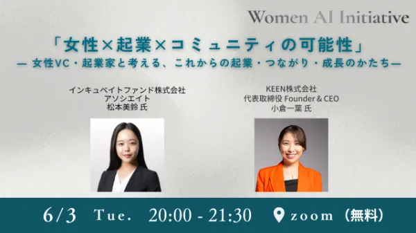 2025年6月3日(火)、Women AI Initiative meet up #16 をオンラインで開催しました。今回は【女性×コミュニティ×起業】をテーマに、投資家と起業家それぞれの視点から「関係資本」や「つながり」が女性のスケールアップにどう貢献するかを探る対談セッションを行いました。